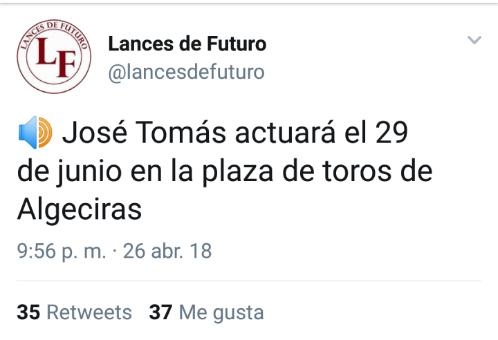 José Tomás toreará en Algeciras. Así lo acaba de anunciar la empresa Lances de Futuro hace sólo media hora a través de Twitter. La fecha elegida es el 29 de junio.