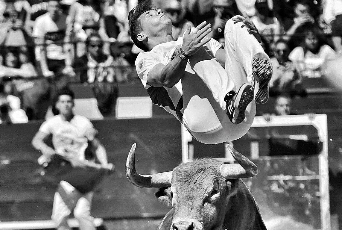 No apto para cardiacos fue el cuarto grupo con un bravo toro vazqueño, berrendo capirote y alunarado. Un astado con transmisión y buena condición. Alberto Ciudad, saltó de inicio y realizó varios quiebros de rodillas. Fran Martínez ‘Panchito’ se fue también rodillas y cuajó varios notables saltos que caldearon el ambiente. Iván Sánchez se entregó por completo, levantó a la gente del tendido con un quiebro de rodillas de órdago, otro desplante ajustadísimo y a la tercera suerte fue volteado y herido en un fea cogida. César Grasa realizó varios buenos saltos y un ajustadísimo recorte que llegó a rozarle.