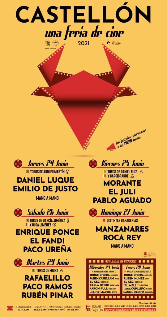 - Martes, 29 de junio. Toros de MIura para Rafaelillo, Paco Ramos y Rubén Pinar.