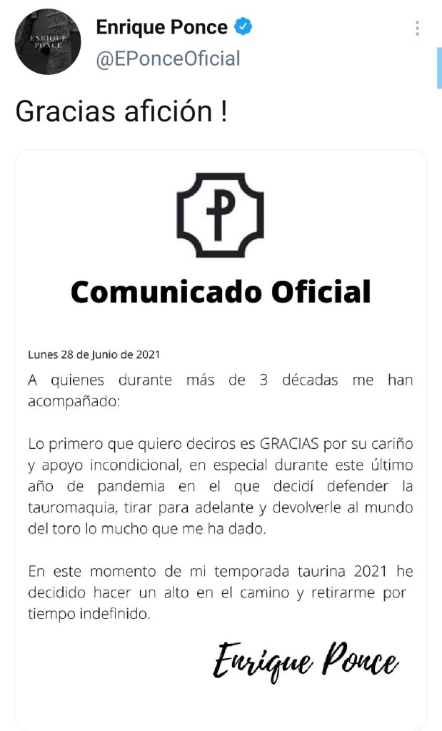 Estoy seguro de que un torero de esta dimensión (podría decir sobrenatural) no se va así como así. Al mismo tiempo que trato de asimilarlo estoy seguro de que Enrique Ponce no ha dicho su última palabra en el toreo. Solo que, por primera vez en todo este tiempo, probablemente, no estaba disfrutando del toreo. Mientras, y pase lo que pase, gracias, gracias estimular mi afición, por colaborar en agrandarla, educarla y permitirme vivirla con pasión.