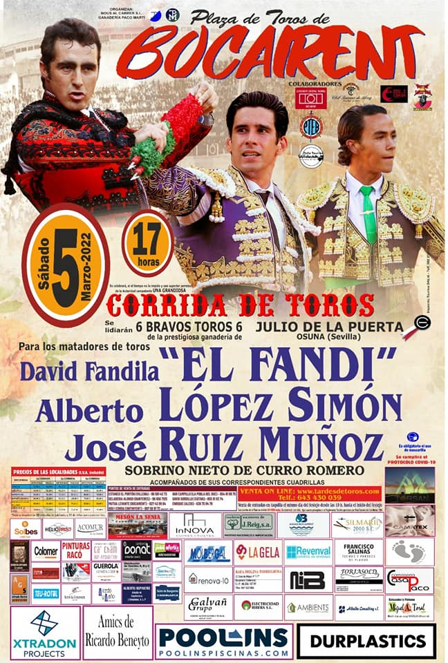 Con la pandemia como un antes y un después, la plaza de toros de Bocairent toma impulso y afronta una temporada histórica con la programación de hasta tres festejos de primer nivel en los que van estar Paco Ureña, Roca Rey, Pablo y Guillermo Hermoso de Mendoza, López Simón o El Fandi. Son tres festejos los que organiza el tándem que forman la empresa Bous al Carrer de Gregorio de Jesús y la Ganadería de Paco Martí.