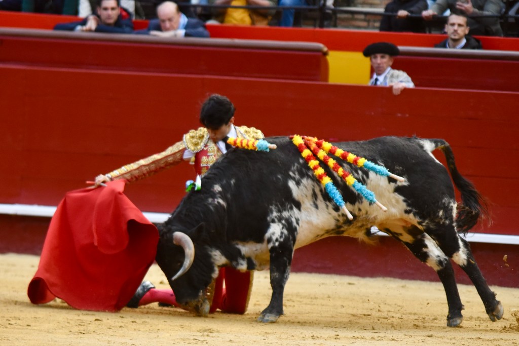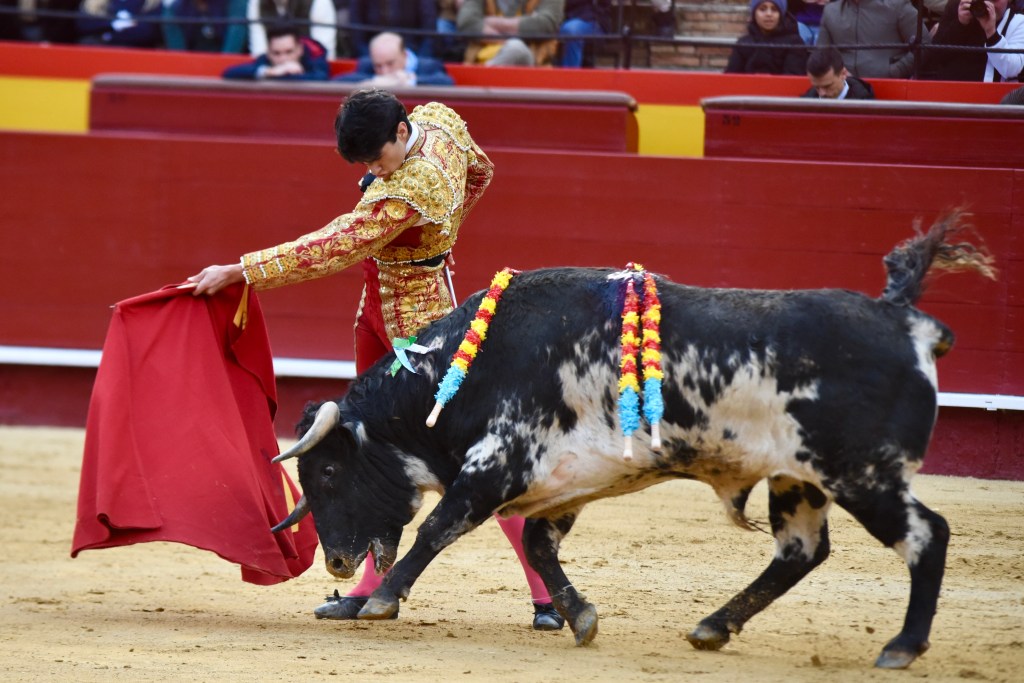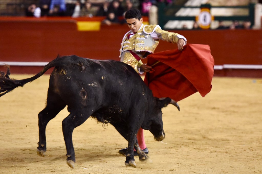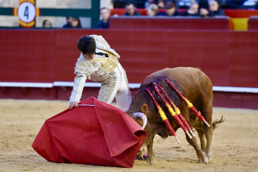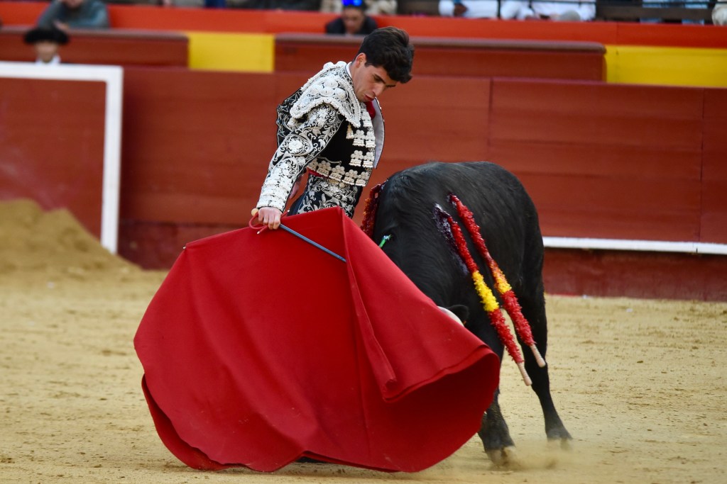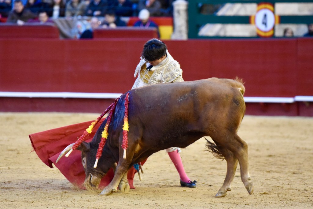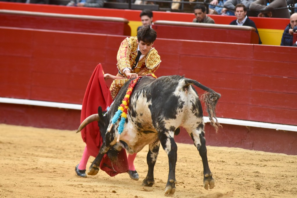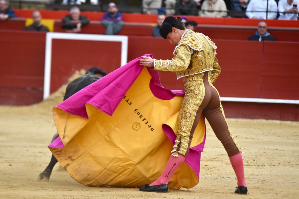 Buen oficio de Nicolás Cortijo, de Albacete. Dándole suavidad a los vuelos a la hora de torear. Embebiendo bien el viaje de un novillo bastante parado. La espada se le atragantó.