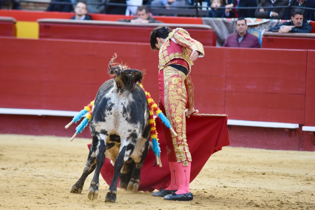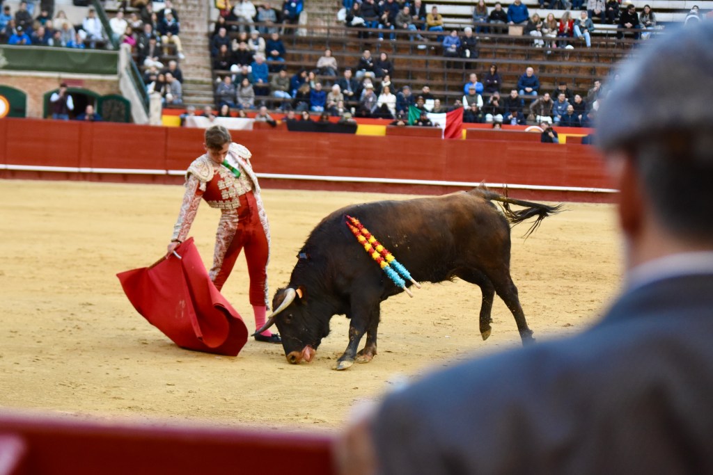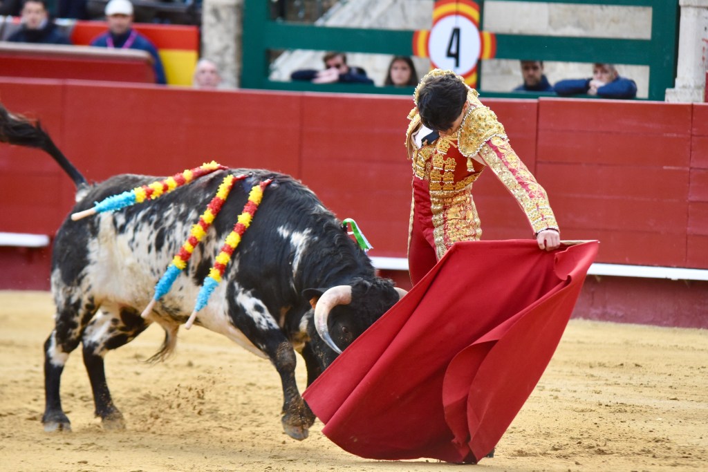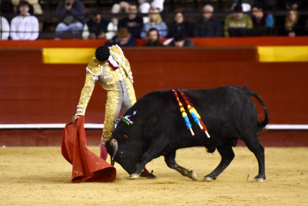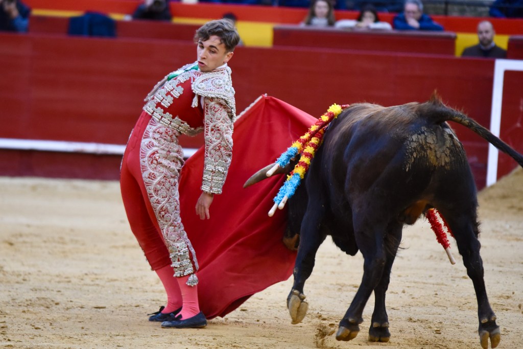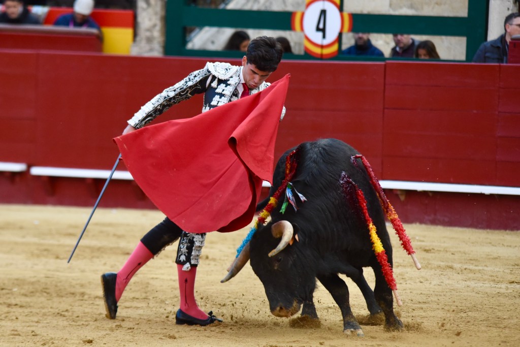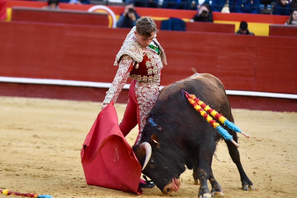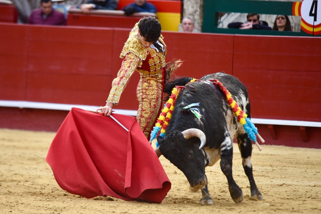 Buen oficio de Nicolás Cortijo, de Albacete. Dándole suavidad a los vuelos a la hora de torear. Embebiendo bien el viaje de un novillo bastante parado. La espada se le atragantó.