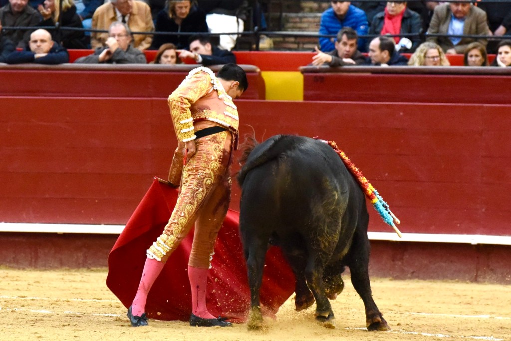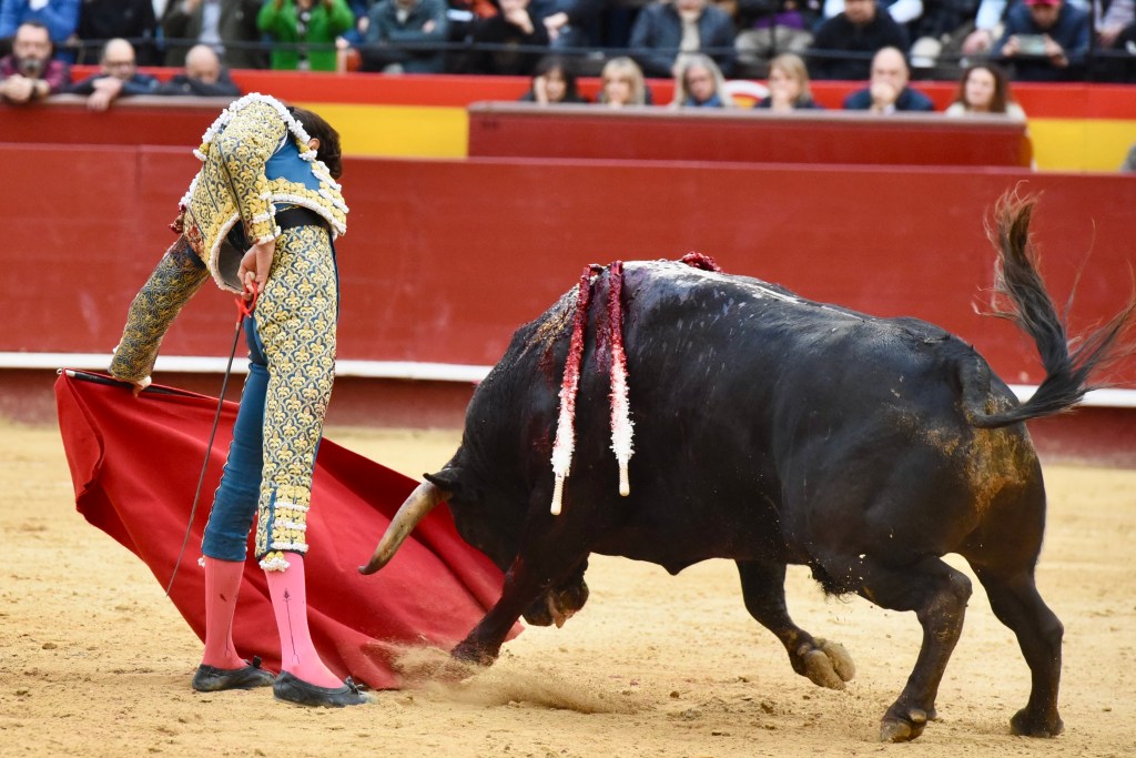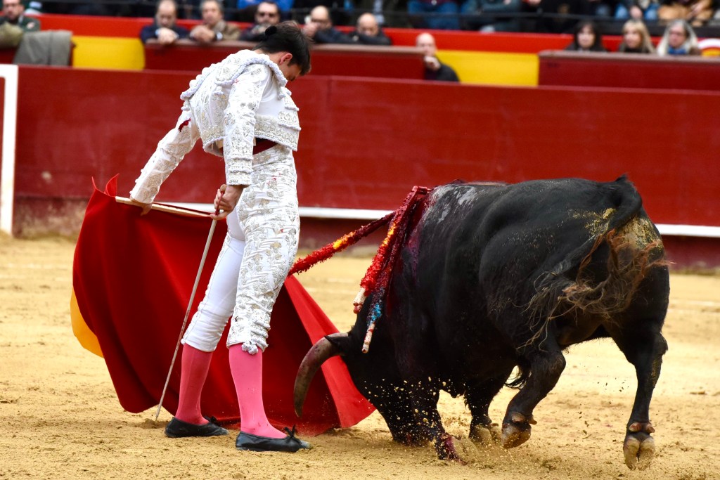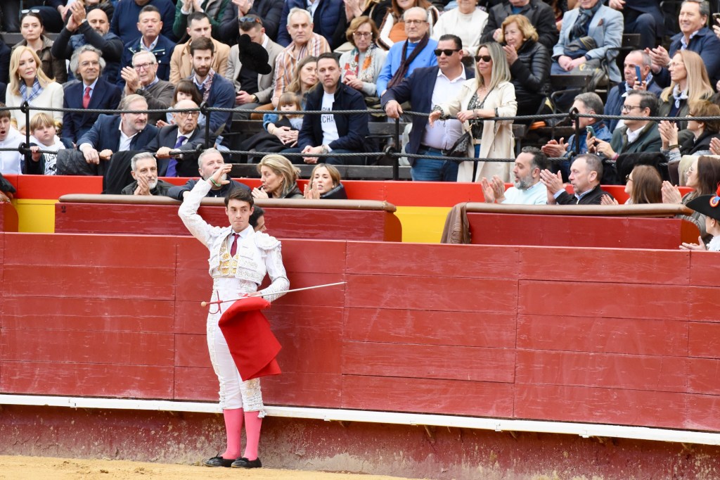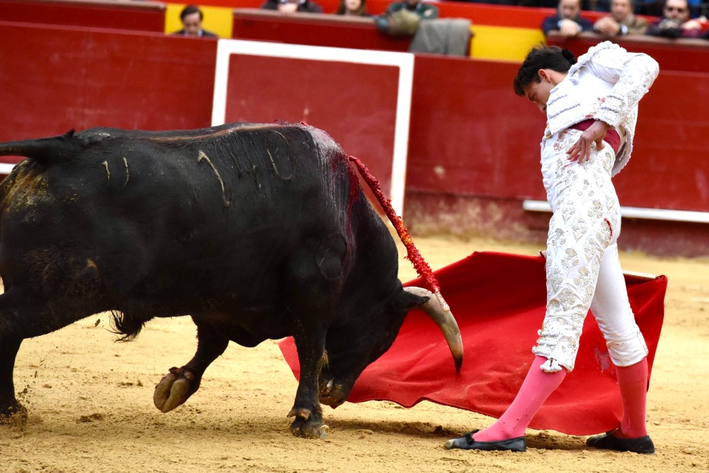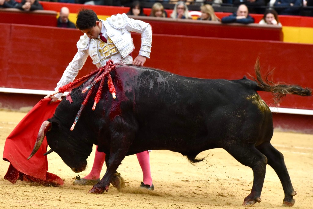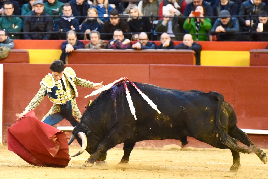 El primer puyazo bajo le hace una sangría que pronto le llega a la pezuña y le merma la condición. Será un punto de fuga de la casta y el poder del animal al final de la faena. La cuadrilla lo arreglará en banderillas. Juan Carlos Rey y Fernando Sánchez se desmonteran y el rubio Iván García lo borda con la capa. Ceremonia y brindis a los padres. Excelente fondo del toro. Las cuatro primera tandas tienen ritmo. En inicio de rodillas en los medios, planea el animal. Lo templa el madrileño Chicharro, que ese será su principal hándicap, ser de la sierra madrileña y no de la huerta valenciana en el día de su alternativa fallera. Por no forzar y administrar ese fondo del toro, Chicharro abusa de demasiada línea recta con la diestra y no se abandona al toreo. Apuesta en las bernardinas finales y un monumental pase de pecho. Pinchazo hondo y descabello tras aviso. Una oreja.
