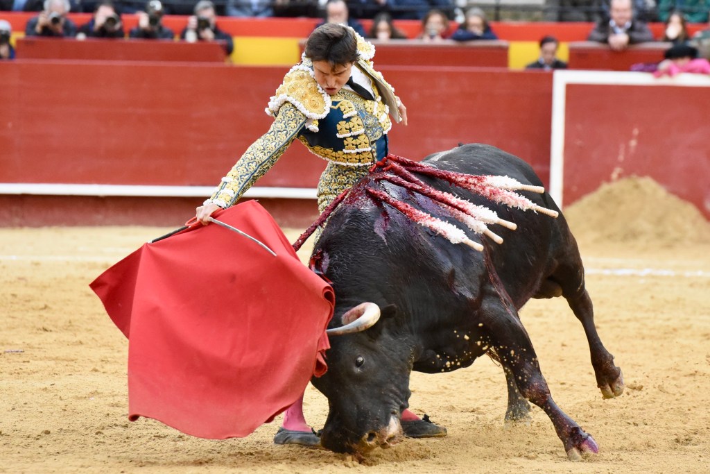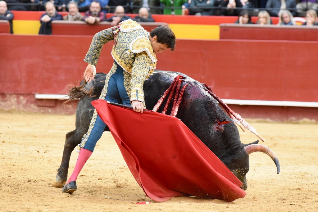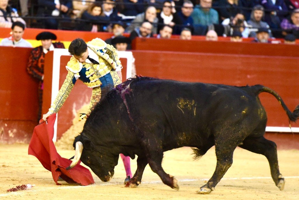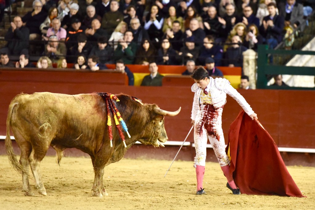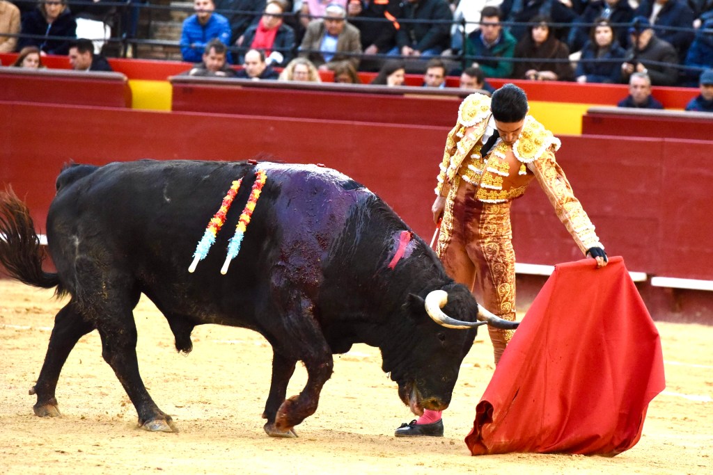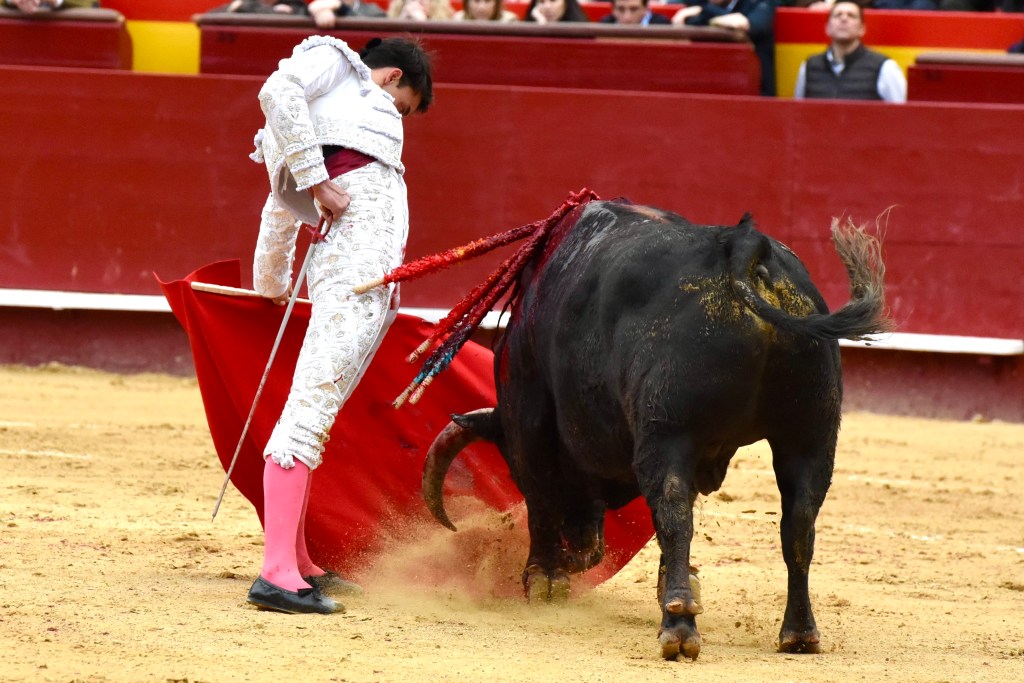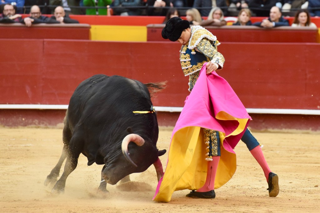 El primer puyazo bajo le hace una sangría que pronto le llega a la pezuña y le merma la condición. Será un punto de fuga de la casta y el poder del animal al final de la faena. La cuadrilla lo arreglará en banderillas. Juan Carlos Rey y Fernando Sánchez se desmonteran y el rubio Iván García lo borda con la capa. Ceremonia y brindis a los padres. Excelente fondo del toro. Las cuatro primera tandas tienen ritmo. En inicio de rodillas en los medios, planea el animal. Lo templa el madrileño Chicharro, que ese será su principal hándicap, ser de la sierra madrileña y no de la huerta valenciana en el día de su alternativa fallera. Por no forzar y administrar ese fondo del toro, Chicharro abusa de demasiada línea recta con la diestra y no se abandona al toreo. Apuesta en las bernardinas finales y un monumental pase de pecho. Pinchazo hondo y descabello tras aviso. Una oreja.
