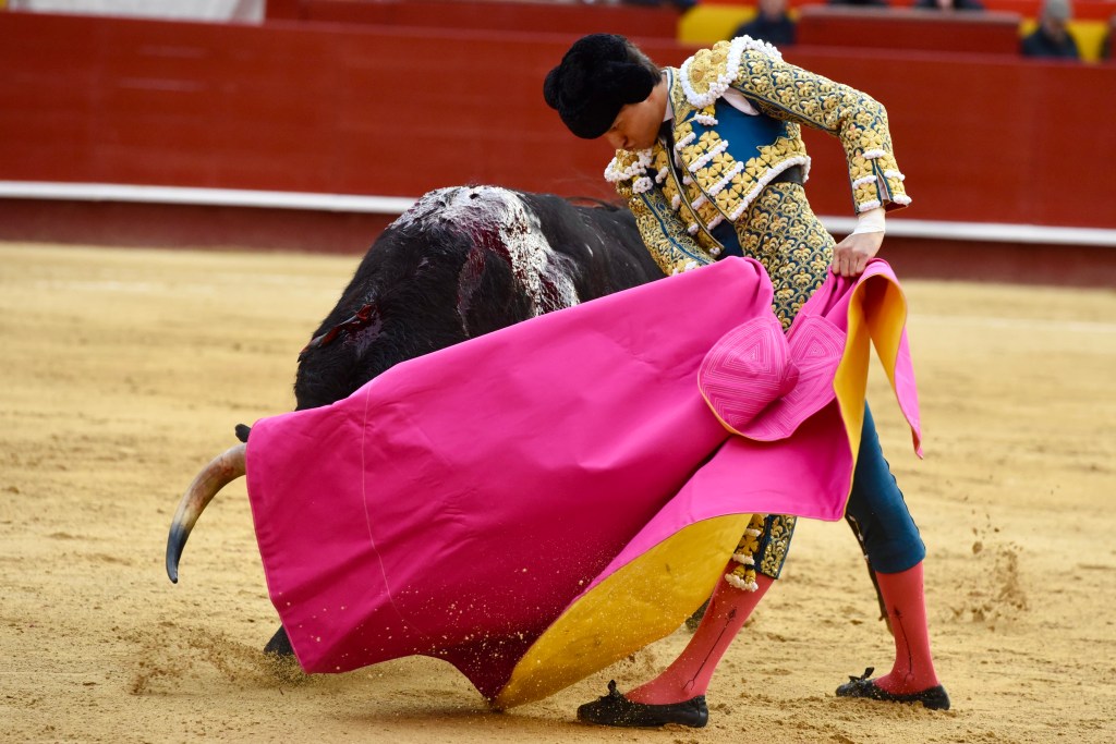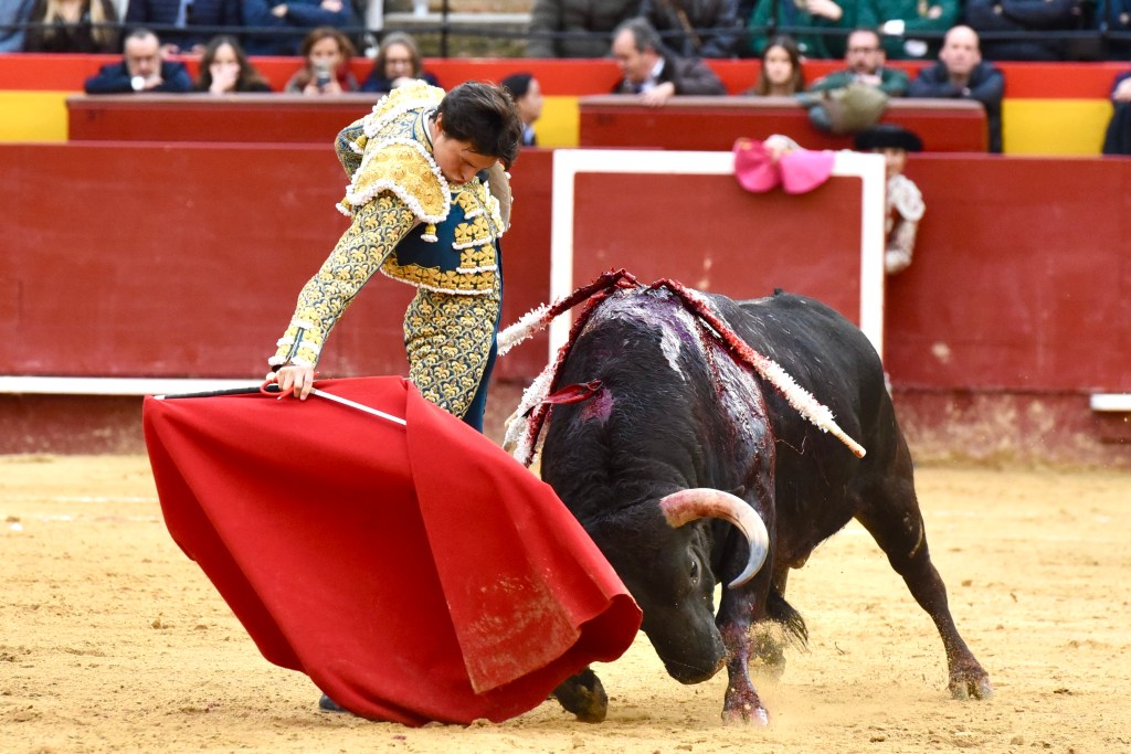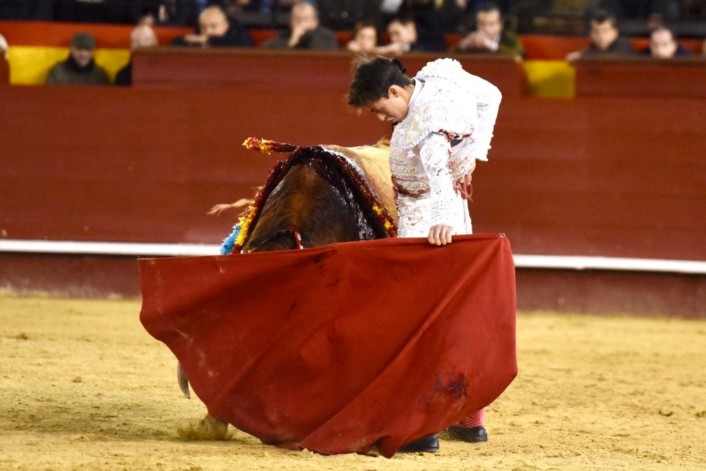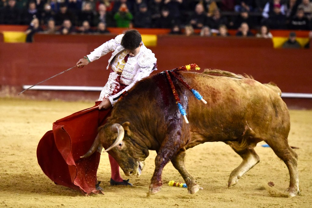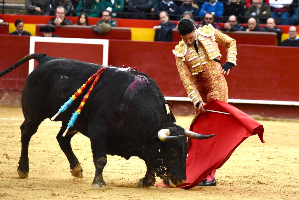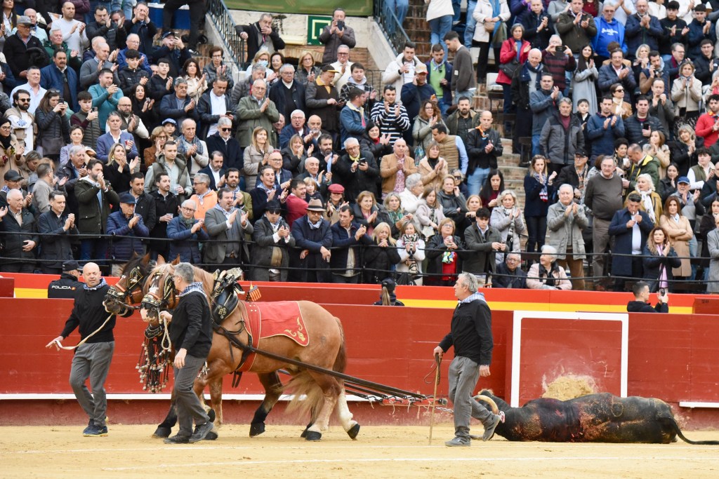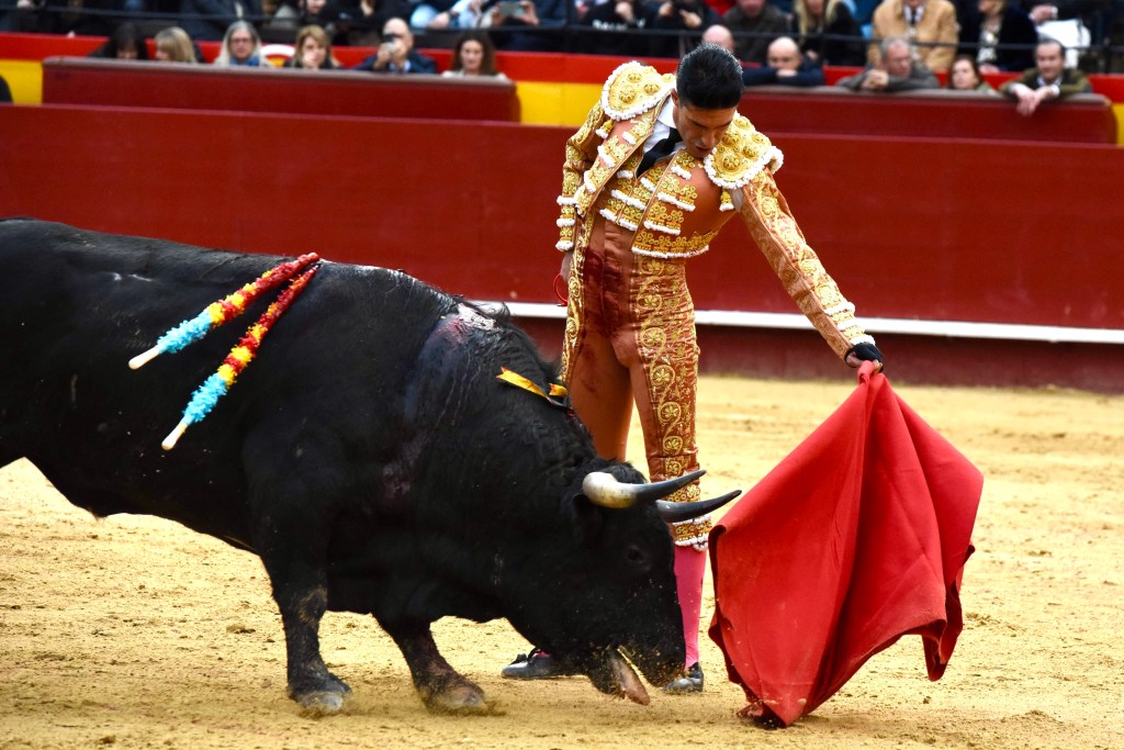 El primer puyazo bajo le hace una sangría que pronto le llega a la pezuña y le merma la condición. Será un punto de fuga de la casta y el poder del animal al final de la faena. La cuadrilla lo arreglará en banderillas. Juan Carlos Rey y Fernando Sánchez se desmonteran y el rubio Iván García lo borda con la capa. Ceremonia y brindis a los padres. Excelente fondo del toro. Las cuatro primera tandas tienen ritmo. En inicio de rodillas en los medios, planea el animal. Lo templa el madrileño Chicharro, que ese será su principal hándicap, ser de la sierra madrileña y no de la huerta valenciana en el día de su alternativa fallera. Por no forzar y administrar ese fondo del toro, Chicharro abusa de demasiada línea recta con la diestra y no se abandona al toreo. Apuesta en las bernardinas finales y un monumental pase de pecho. Pinchazo hondo y descabello tras aviso. Una oreja.