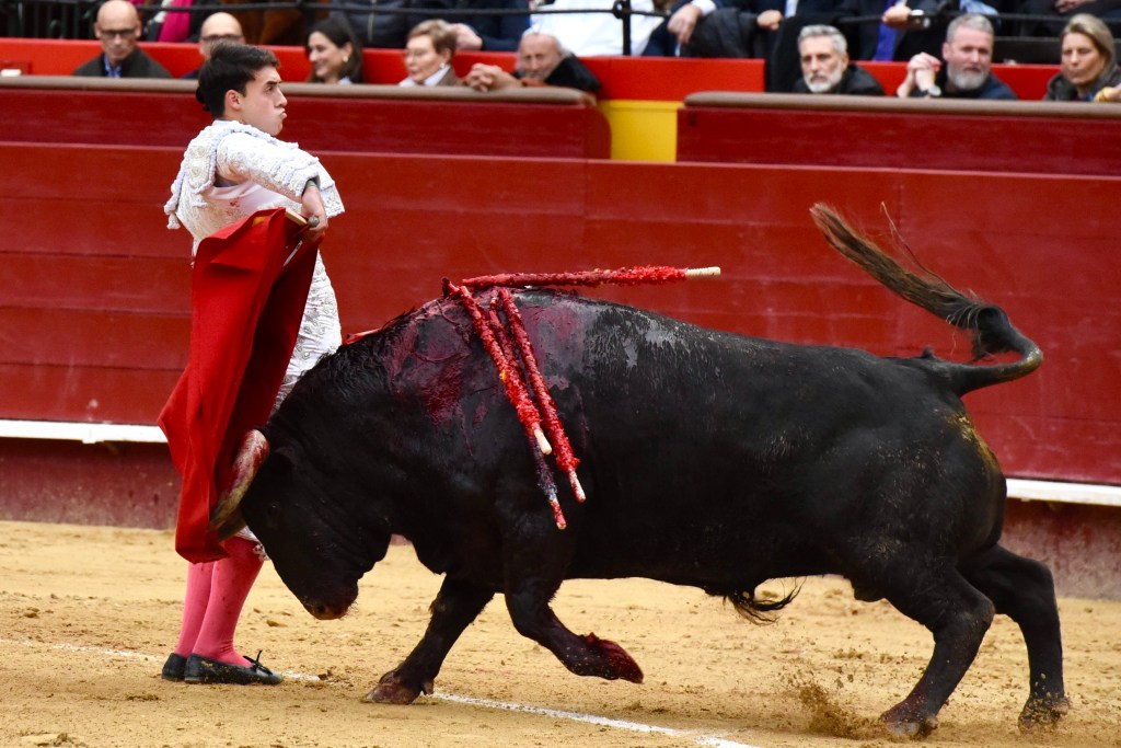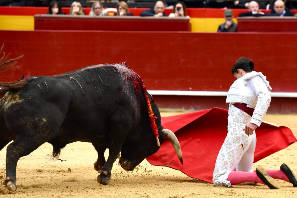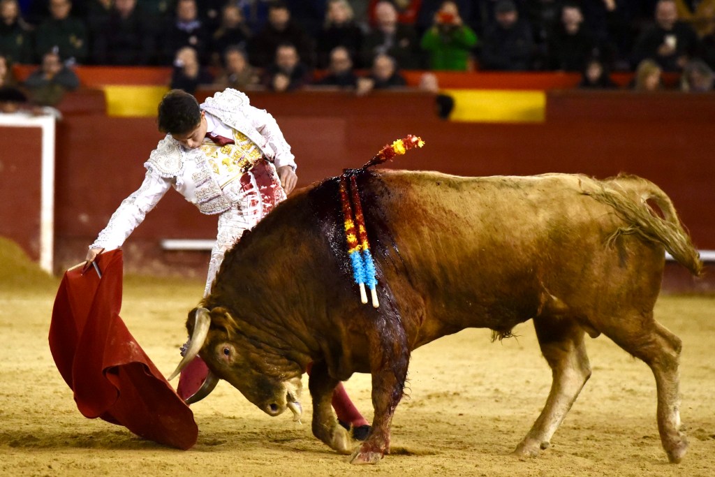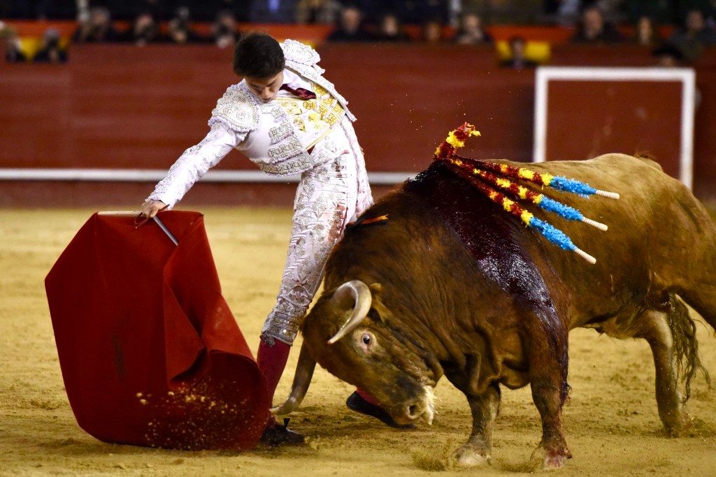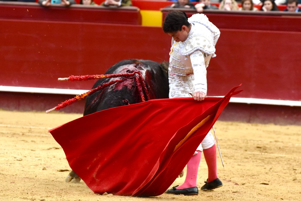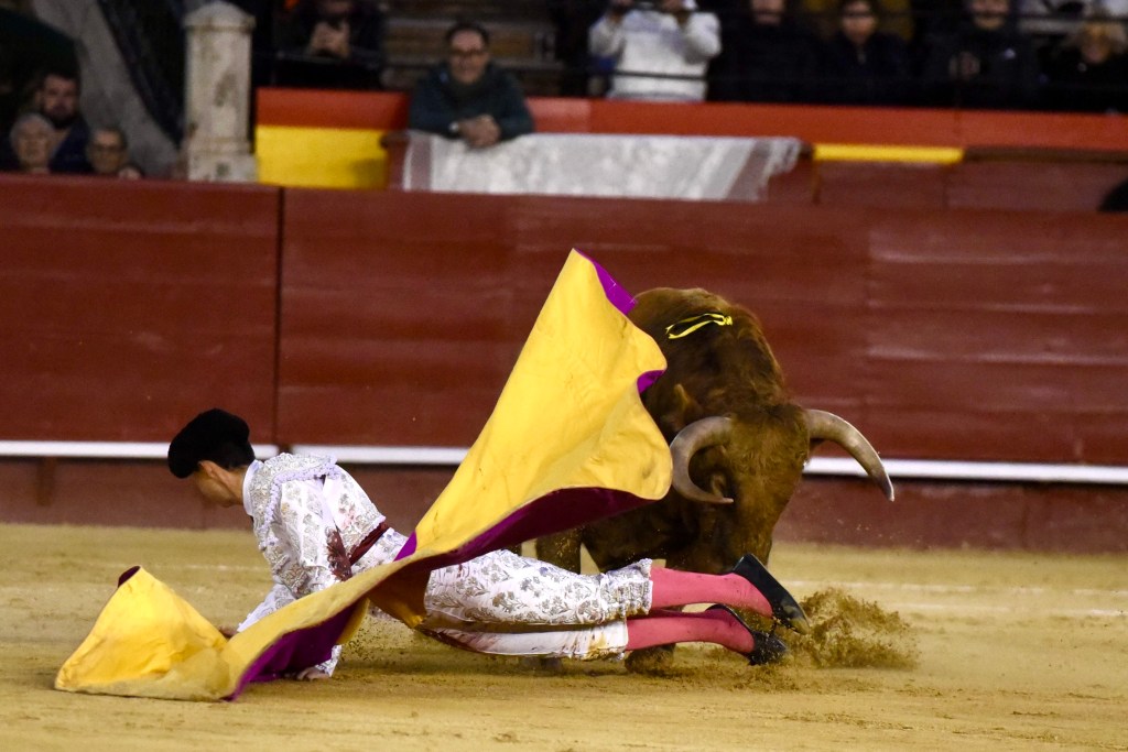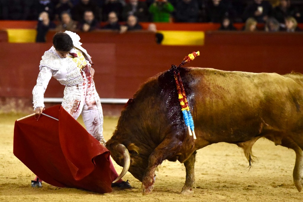 El primer puyazo bajo le hace una sangría que pronto le llega a la pezuña y le merma la condición. Será un punto de fuga de la casta y el poder del animal al final de la faena. La cuadrilla lo arreglará en banderillas. Juan Carlos Rey y Fernando Sánchez se desmonteran y el rubio Iván García lo borda con la capa. Ceremonia y brindis a los padres. Excelente fondo del toro. Las cuatro primera tandas tienen ritmo. En inicio de rodillas en los medios, planea el animal. Lo templa el madrileño Chicharro, que ese será su principal hándicap, ser de la sierra madrileña y no de la huerta valenciana en el día de su alternativa fallera. Por no forzar y administrar ese fondo del toro, Chicharro abusa de demasiada línea recta con la diestra y no se abandona al toreo. Apuesta en las bernardinas finales y un monumental pase de pecho. Pinchazo hondo y descabello tras aviso. Una oreja.
