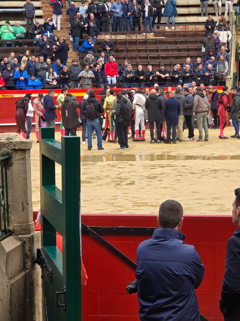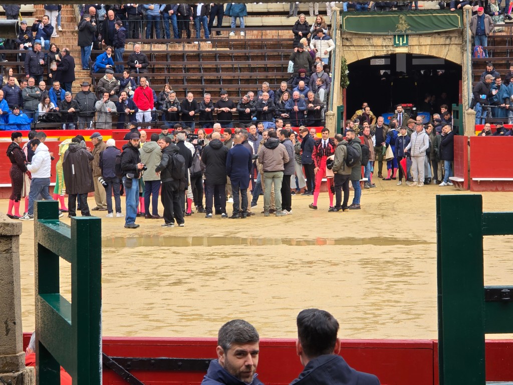 Lo cierto es que llovió lo suficiente como para tener el ruedo inservible tras la novillada del jueves. Es posible que no hubiera tiempo material y sin lluvia para adecentar el ruedo. Seguramente los que habían pasado por taquillas eran los suficientes como para dar el festejo y empatar en caja. Pero ya no sé si merecían el esfuerzo y los materiales para adecentar de verdad el ruedo y no dejarlo todo en varias tractoradas sin pala, un mísero saco de arena y seis o siete capazos. Demasiado poco para un ruedo de 47 metros de diámetro con historia y una dignidad. Seguramente a las 12 del mediodía se tenía que haber anunciado la suspensión y evitar así una situación vergonzante, vergonzosa. Rancia.